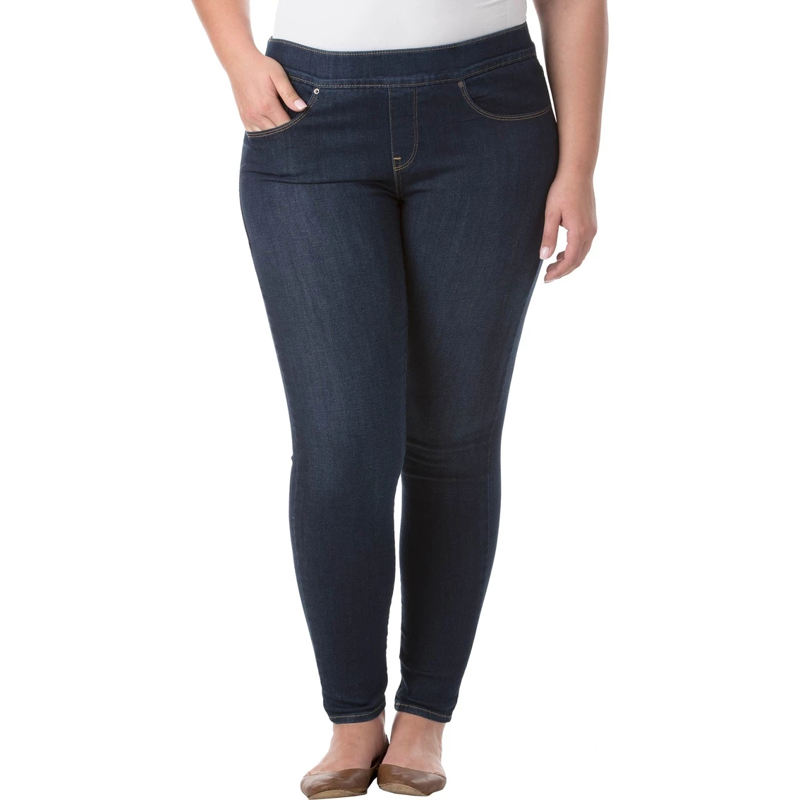 Levi’s Plus Size Perfectly Slimming Pull-On Skinny Jeans give you the classic look of a skinny blue jean with the supreme comfort and mobility of a legging. Cut from super soft fabric with added stretch, these tummy slimming, leg lengthening jeans feature a faux fly and five-pocket styling. Style: 236430002.