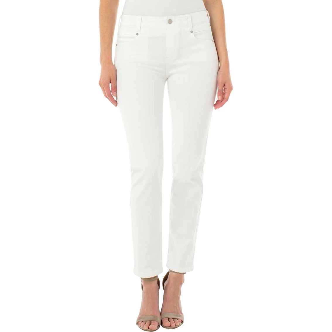 The Liverpool Gia Glider Slim Jeans are a pull-on hybrid with 5-pocket details. They have a faux zip with single button closure and belt loops. These pants have a 29-in. inseam, 9.5-in. Front rise; 12.5-in. Leg opening. Mid-rise. Composition: 60% Cotton, 22% Rayon, 17% Poly, 1% Spandex. Style: LM2401CH1.