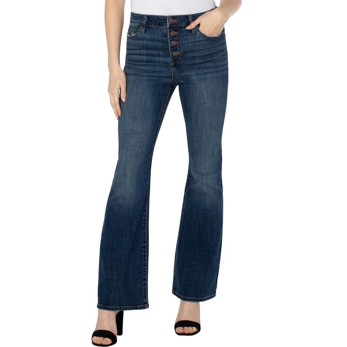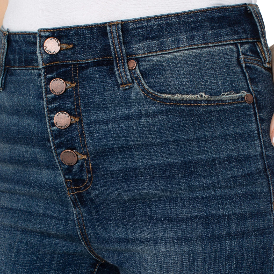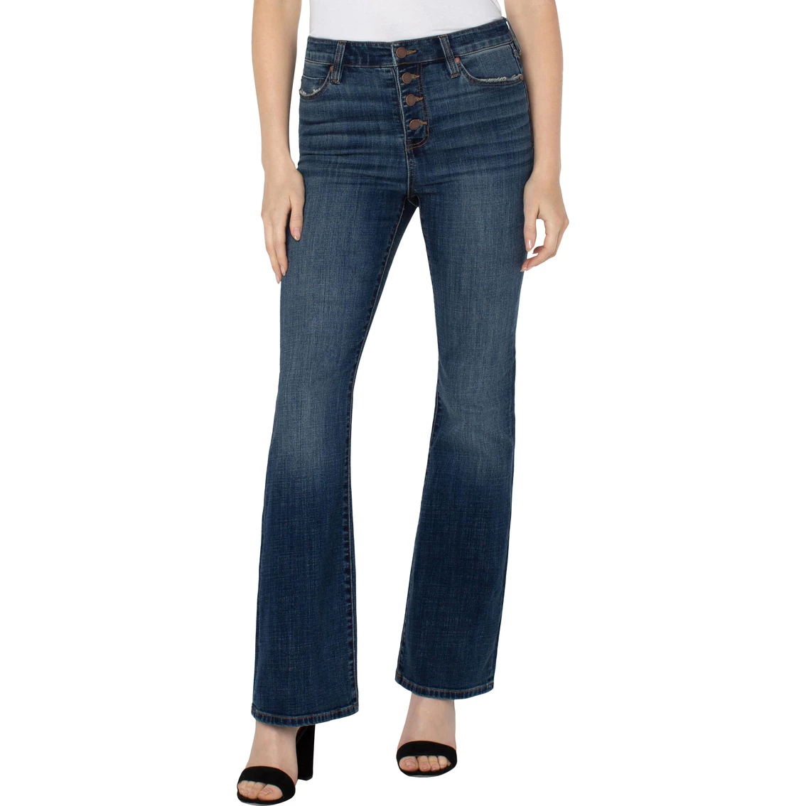 Mid Rise Lucy Bootcut jean in our must have Missoula wash. Slim thru the hips and thighs then releases at the knee and leg opening to create the beautiful bootcut shape. The exposed button front is a great detail! Style: LM4085CH1410.