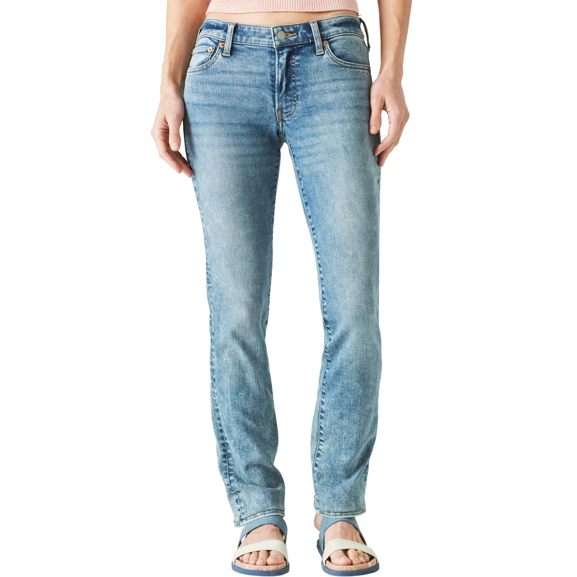 An easy, laid-back fit made to be worn every day, the Mid-Rise Sweet Straight jeans from Lucky Brand have classic appeal and are cut close to the body for a slim look and comfortable feel. Made with denim material, these jeans are a versatile pair.
