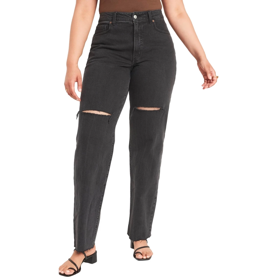 The loose rap on these Old navy O.G. Loose Jeans — think mom jeans, if your mom was effortlessly chic. Part ’90s nostalgia, part new-normal comfort, served straight up with enough roominess for cool comfort. Feature contoured high-rise waistband with button closure and built-in belt loops, hidden zip fly, riveted scoop pockets and coin pocket at front, patch pockets at back. Clever Secret-Smooth front pockets hold you in for a smoothing effect. Their little secret — rayed rips, raw-edge cut-off leg openings, fading and whiskering create a distressed, lived-in look. Durable black-wash denim, with a hint of comfortable stretch for a broken-in feel. This pair of jeans is made with 5% recycled cotton, less waste in the world. Never-Quit Shape Retention holds its shape and hugs in all the right places wear after wear. Tag-free label inside back waist for added comfort. BodEquality means size equality, price equality style for women everywhere. They redesigned your favorite fashions (in sizes 16-24 XL-3X) to create their most comfortable fit yet. Check out your current size for an improved look and feel.