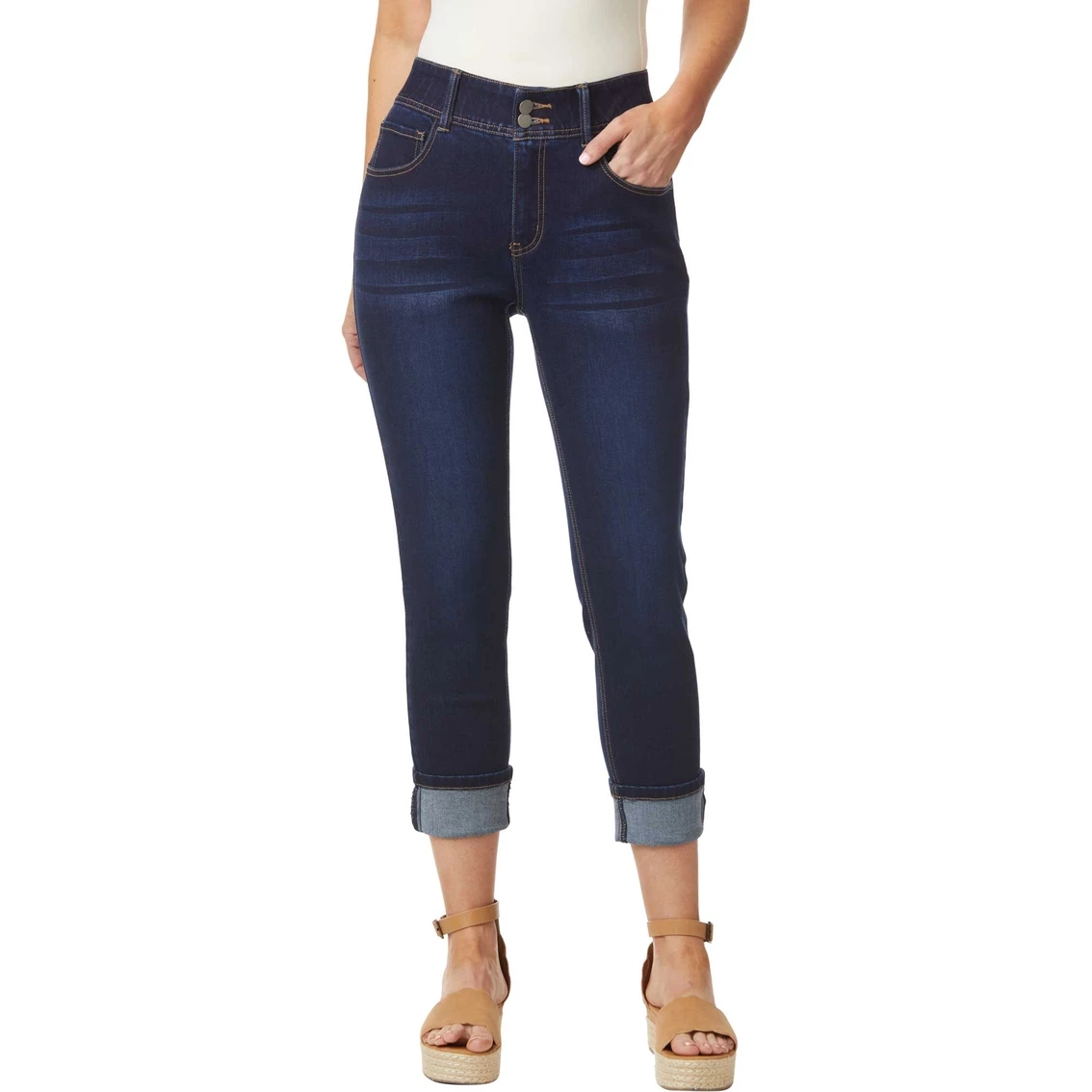 These capri jeans from Passports make a great start to a comfortable outfit. They have a cuffed design and belt loops and are machine washable for easy care. Style: MCS54276AAFES.